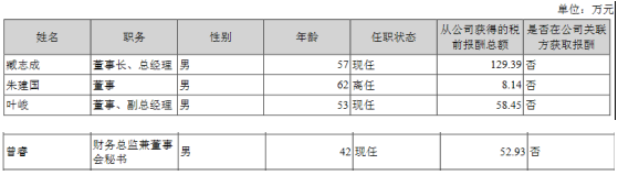 从公司核心人员收入情况来看,公司董事长臧志成,去年税前薪酬为129.39万元;副总经理叶峻去年税前年薪为58.45万元;财务总监曾睿的去年税前薪酬为52.93万元。
