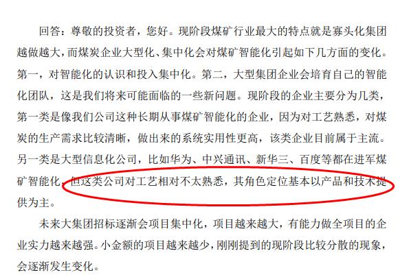 针对华为、中兴通讯、新华三、百度等近年来进军煤矿智能化,科达自控更是主动提及,称这类公司对工艺相对不太熟悉,其角色定位基本以产品和技术提供为主。