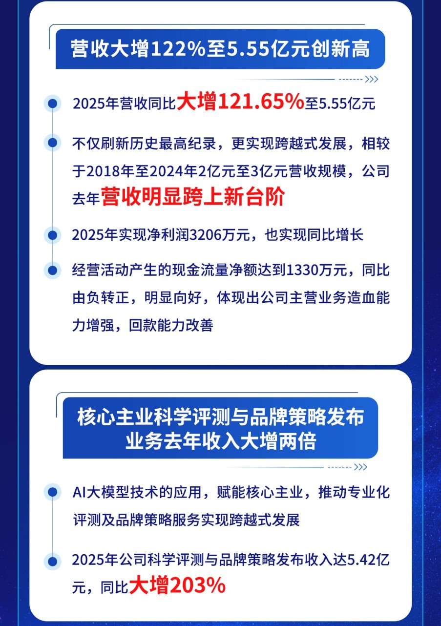 营收实现大幅增长,得益于公司精准把握前沿技术,将AI大模型深度融入服务,推动核心主业科学评测与品牌策略发布业务收入大增,实现收入达5.42亿元,同比大增203%。