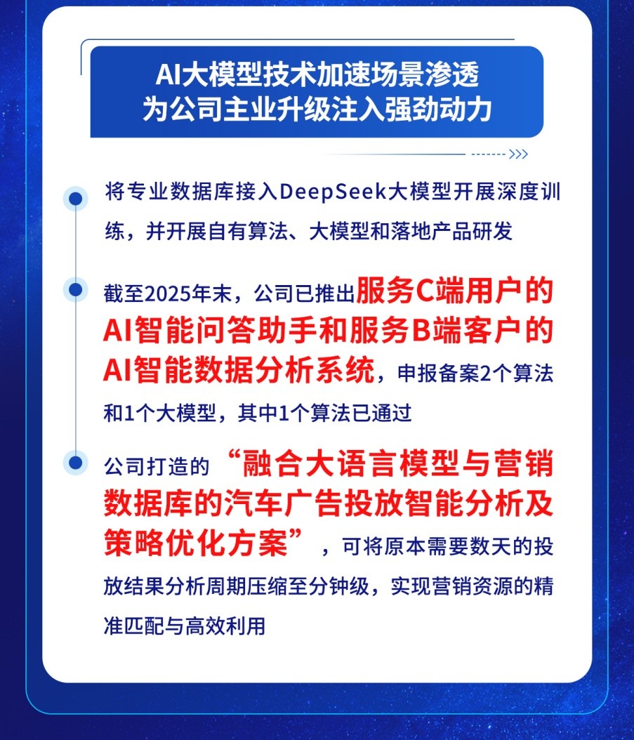 据悉,AI大模型技术加速场景渗透,为车讯互联主业升级注入强劲动力。公司将专业数据库接入DeepSeek大模型开展深度训练,并开展自有算法、大模型和落地产品研发,截至2025年末,公司已推出服务C端用户的AI智能问答助手和服务B端客户的AI智能数据分析系统,申报备案2个算法和1个大模型,其中1个算法已通过。