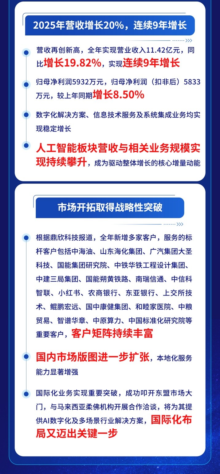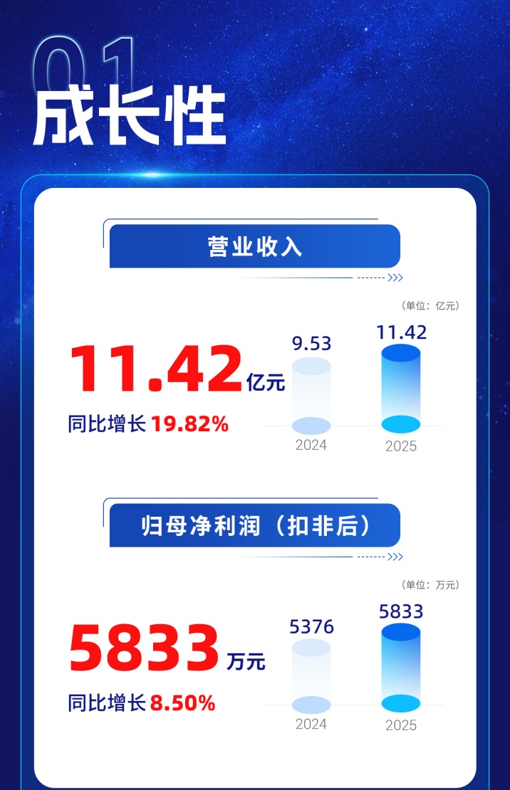 2025年,鼎欣科技(870840)实现营业收入11.42亿元,再创新高,同比增长19.82%,实现连续9年增长;归母净利润5932万元,归母净利润(扣非后)为5833万元,较上年同期增长8.50%。