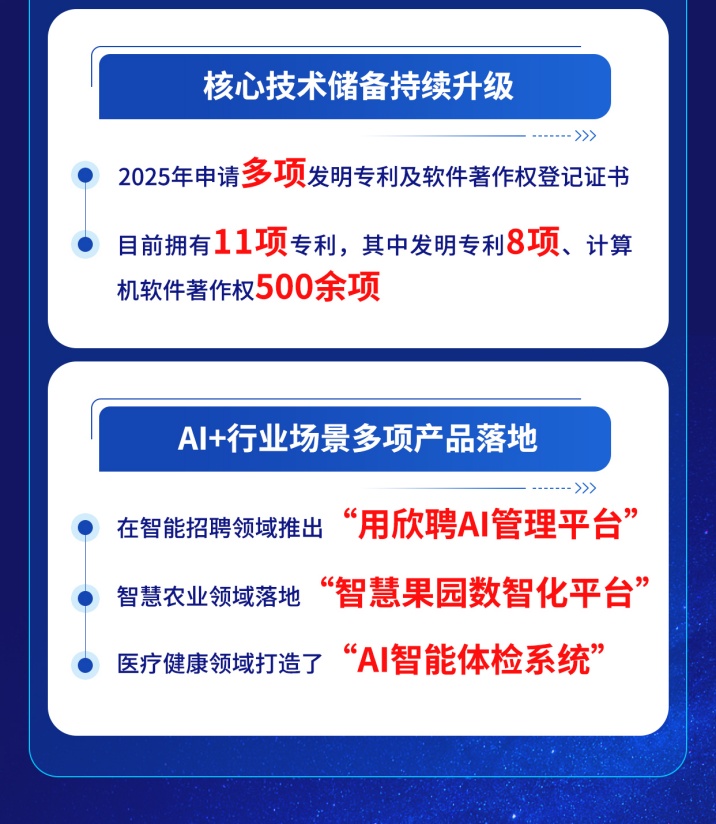2025年,鼎欣科技积极推进人工智能+行业场景,成功发布了多款产品,在智能招聘领域推出“用欣聘AI管理平台”、智慧农业领域落地“智慧果园数智化平台”、医疗健康领域打造了“AI智能体检系统”。并且,鼎欣科技AI产品创新成果已获得行业广泛认可。